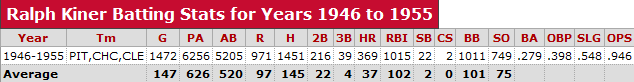 However, as you can also see Kiner was nowhere near the overall player Belle was as he averaged 21 doubles and .279 batting average per season to Belle's 38 doubles and .298 average over a similar 10-year span.