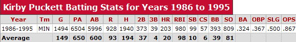 Arguably the greatest center fielder of all time, Kirby Puckett sadly saw his career cut short after a pitch hit him in the head, ruining his vision. Puckett might actually be the most perfect player with whom to compare Albert Belle in that he was still in his prime at the time of his retirement, having putting together a very good line of .314/.379/.515 with 23 home runs and 99 RBI. From 1986-95, Puckett hit .324, led the league in hits 4 times, and won 2 World Series Titles. He was a 10-time All-Star, a plus defensive player who won 6 Gold Gloves and a team leader.